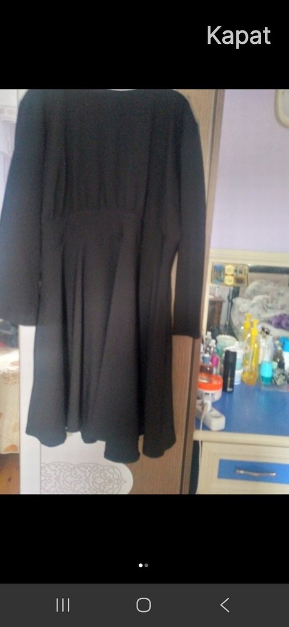 Siyah renkte, uzun kollu, salaş kesim ve drapeli detaylara sahip, yüksek yakalı ve sentetik kumaştan yapılmış elbise. Ofis için uygun gotik tarzda.