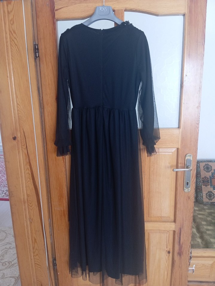 Uzun kollu, salaş kesim ve drapeli tasarıma sahip siyah uzun elbise. Yumuşak sentetik kumaştan yapılmış, yuvarlak yaka ve desensiz, ofis kullanımı için uygun.