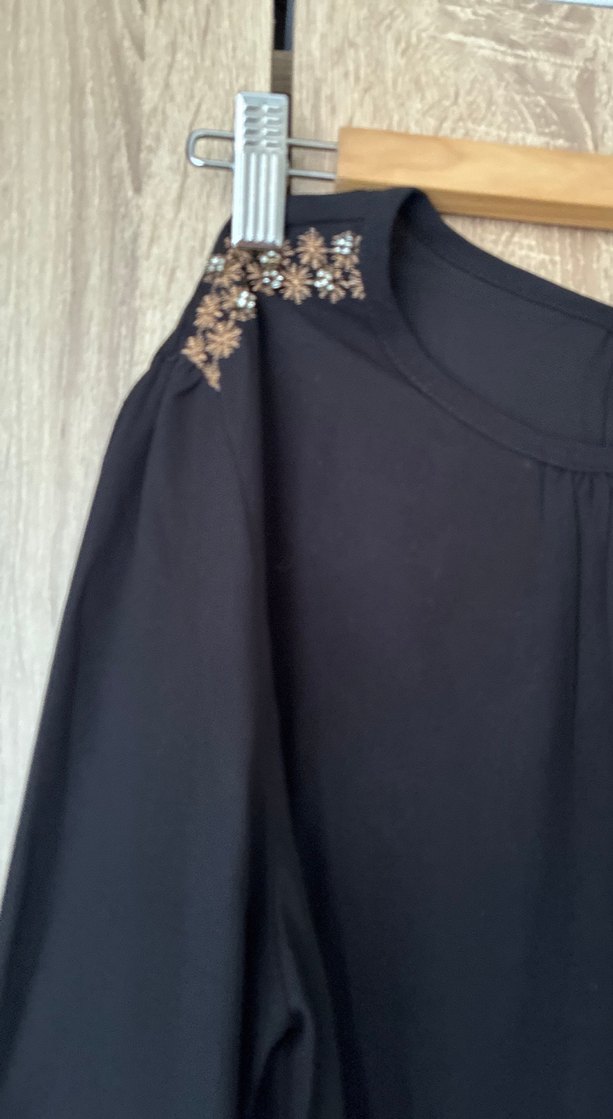 Siyah renkte, crew neck yakalı, uzun kollu ve salaş kesime sahip, drapeli, ipeksi kumaştan yapılmış uzun hamile bluz. Ofis kullanımı için uygundur.
