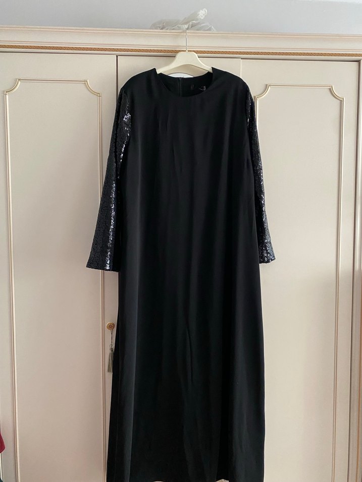 Salaş kesim, uzun siyah elbise, ipeksi dokuda ve drapeli. Uzun kollu, pul detaylı ve yuvarlak yaka, günlük kullanıma uygun. 48 52 beden uyumludur.