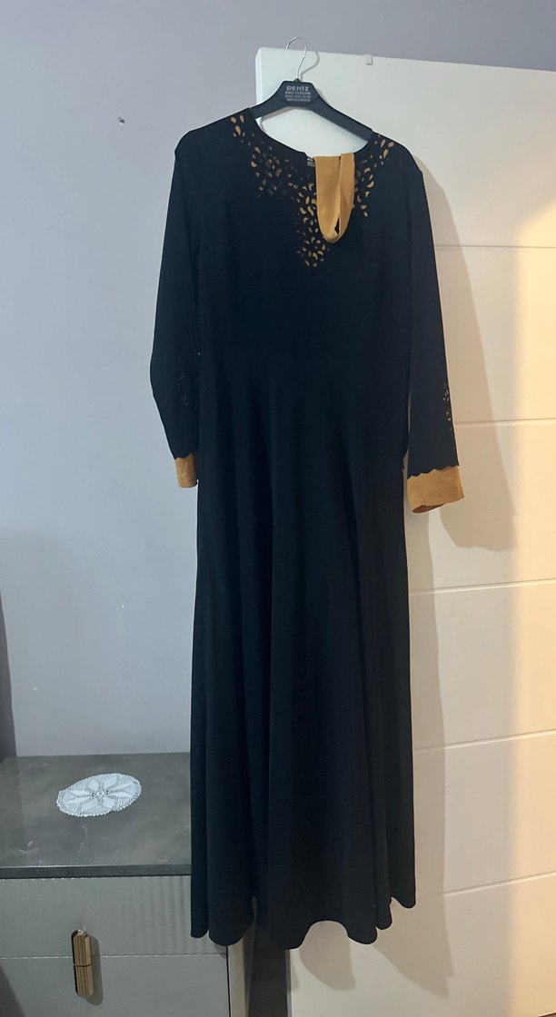 Siyah uzun kollu, yüksek yakalı, salaş kesim kadın elbisesi. İpek gibi kumaştan, dökümlü detaylı, ofis için uygun sade ve mütevazı tarzda.
