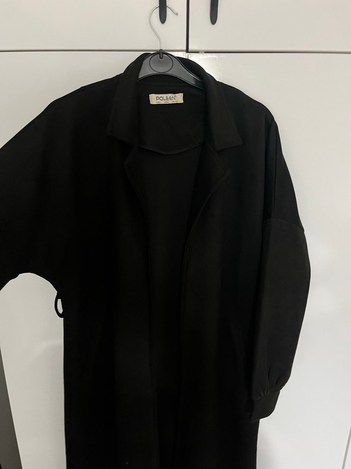 Siyah, uzun kollu, notched lapel yakalı, salaş kesim kadın kaban. Yumuşak ve sıcak kumaştan, gündelik kullanıma uygun minimal ve desensiz tasarım.