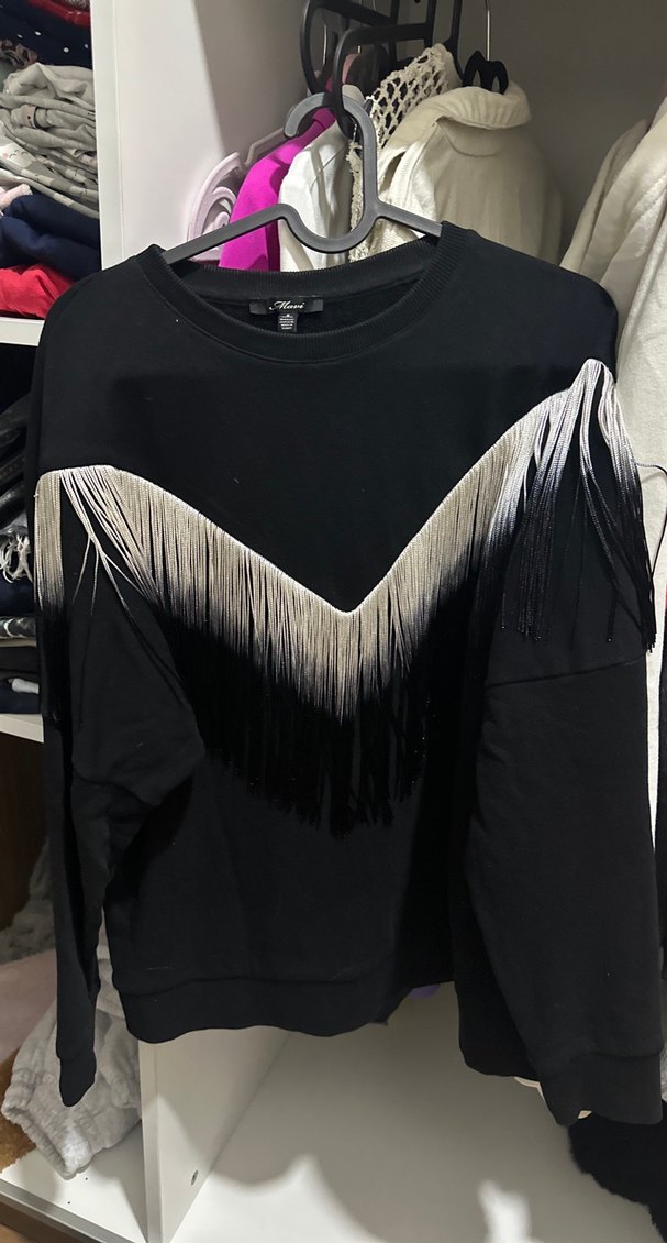 Siyah, uzun kollu, salaş kesim ve bisiklet yaka kadın sweatshirt.