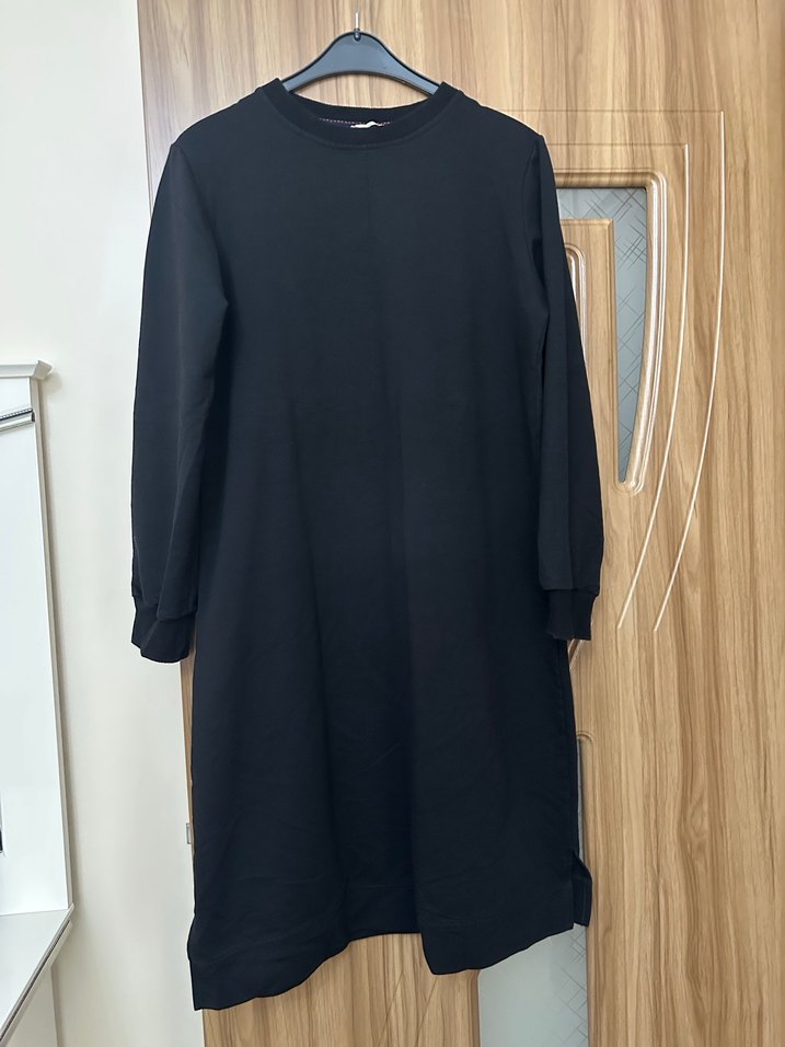 Siyah uzun kollu, salaş kesim ve yuvarlak yakalı iki iplik kumaş