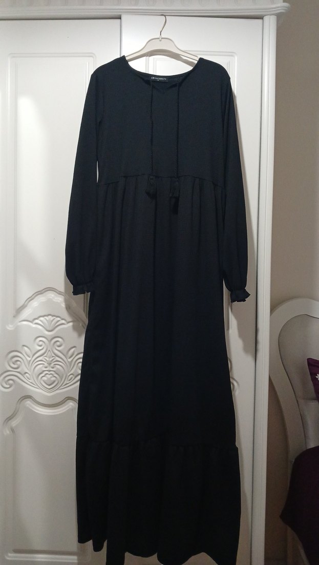 Siyah uzun kollu keten elbise, salaş kesimi ve yuvarlak yakasıyla sade ve rahat bir görünüm sunar. Dökümlü yapısıyla mütevazı tarzı yansıtır.