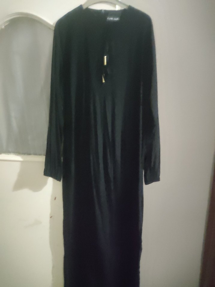 Siyah uzun elbise, yüksek yaka ve uzun kollu tasarıma sahip. İpek gibi kumaştan, salaş kesimle sade ve mütevazı bir görünüm sunar. Günlük kullanım için uygundur.