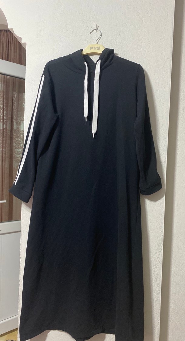 Siyah renkli, uzun kollu, salaş kesim spor elbise. Yüksek yakalı, drapeli ve beyaz ip detaylı, yan şeritli, sentetik kumaştan yapılmıştır.