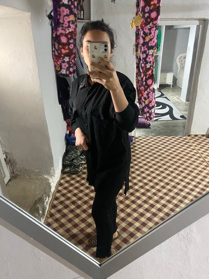 Siyah renkte, uzun kollu ve salaş kesim yakasında kesik yakalı ve dökümlü tasarımıyla ön plana çıkıyor. Parlak ve ipeksi kumaştan üretilmiştir.