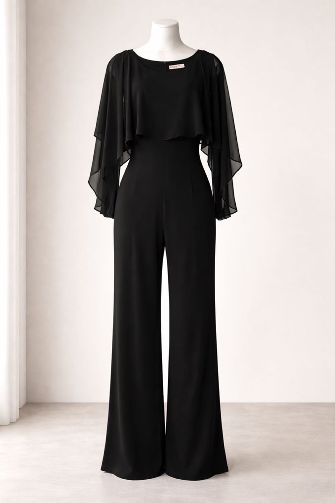 Siyah, uzun kollu, yumuşak ve ipeksi kumaştan salaş kesim tulum. Drapeli tasarımı ve yuvarlak yakasıyla ofis için şık ve çağdaş bir seçenek.