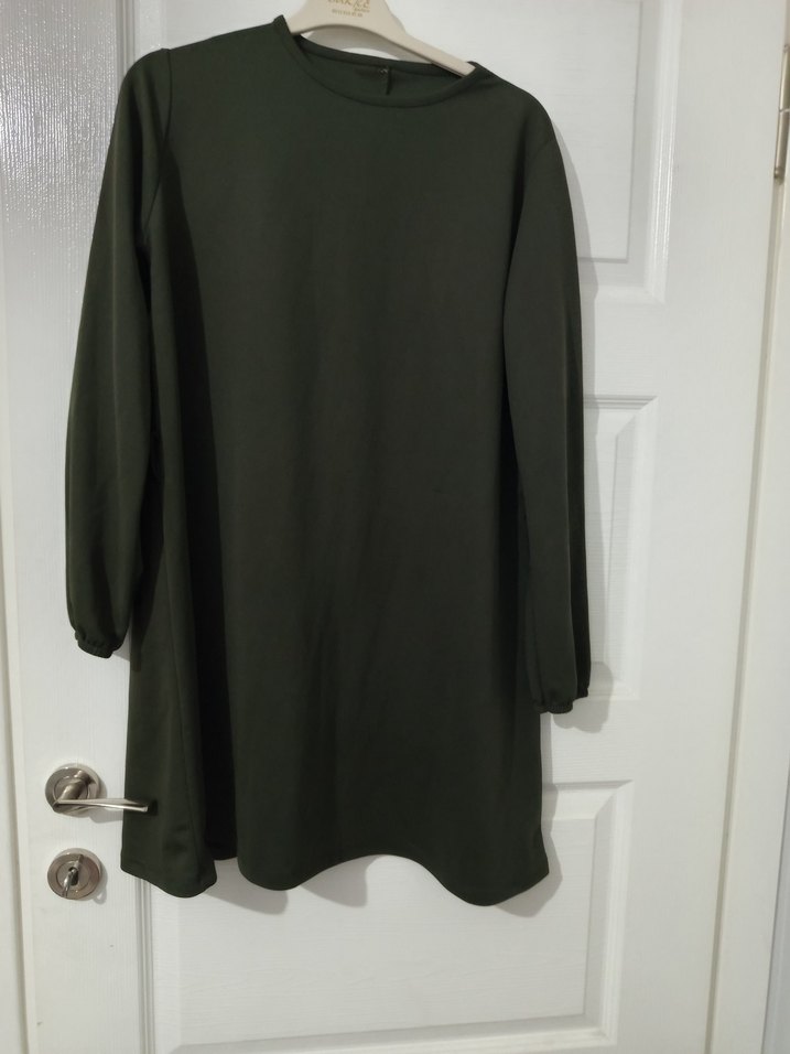 Siyah, uzun kollu, salaş kesim ve bisiklet yaka tunik. Drapeli tasarımı ve sentetik kumaşıyla günlük kullanıma uygun.