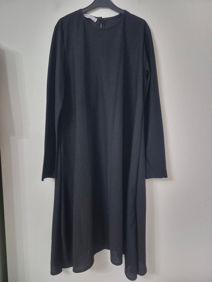 Kadınlar için uzun, salaş kesim ve drapeli siyah tunik. Yuvarlak yaka ve uzun kollu, günlük kullanıma uygun minimalist tarzda.