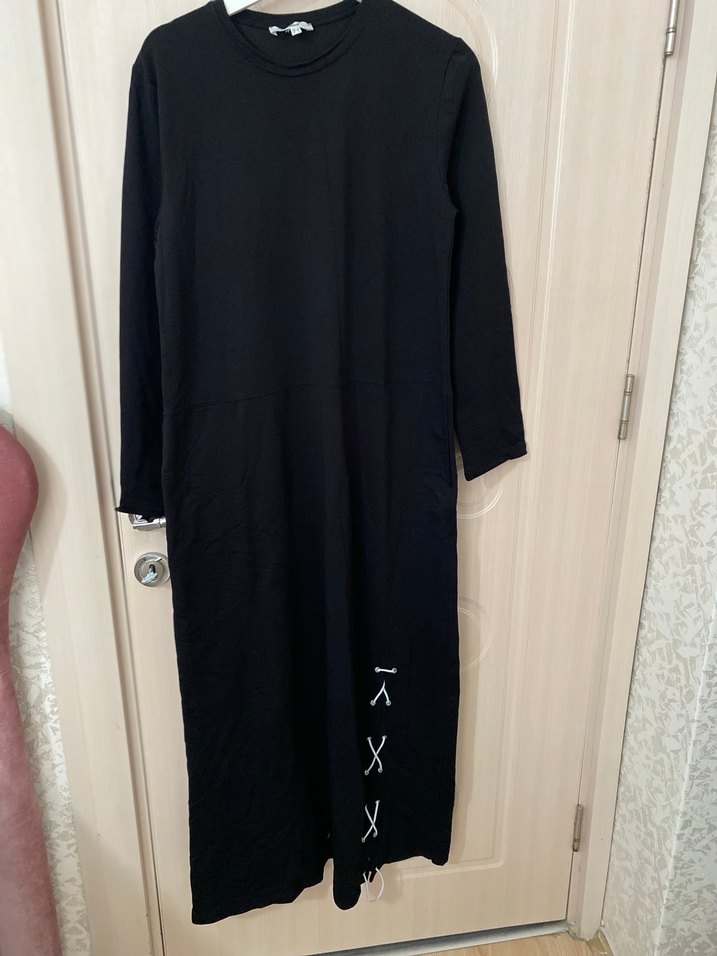 Siyah renkte, uzun kollu, salaş kesim uzun elbise. Sentetik kumaştan üretilmiş, yırtmaç detayı ile minimalist sokak stili sunar.