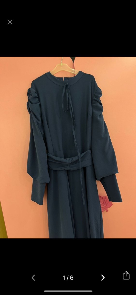 Uzun kollu, yüksek yakalı, salaş kesim siyah uzun elbise. Drapeli detaylar ve kemerle sade, mütevazı bir tarz sunar. Günlük kullanıma uygun.