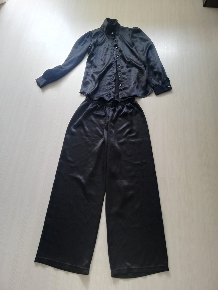 Kadınlar için siyah saten kumaştan, bol kesim ve uzun kollu. Üstü yakalı ve düğmeli, ofis için uygun gotik Paris tarzı.