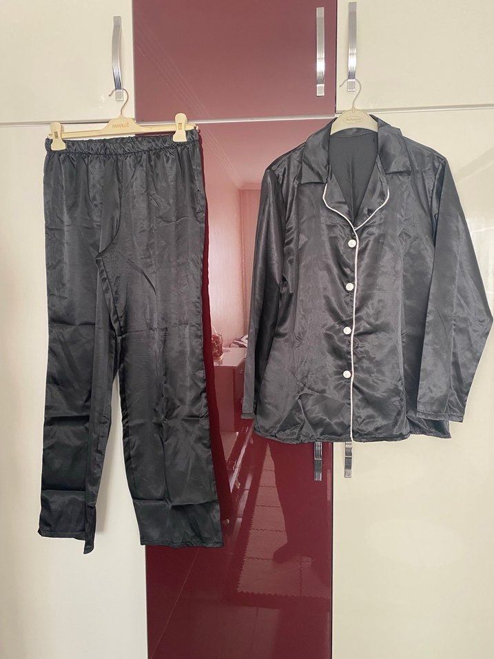 Siyah saten kumaştan, uzun kollu ve regular fit kadın pijama takımı. Düğmeli üst ve lastikli bel pantolon ile rahat kullanım sağlar. Ürün sadece denemek için giyildi