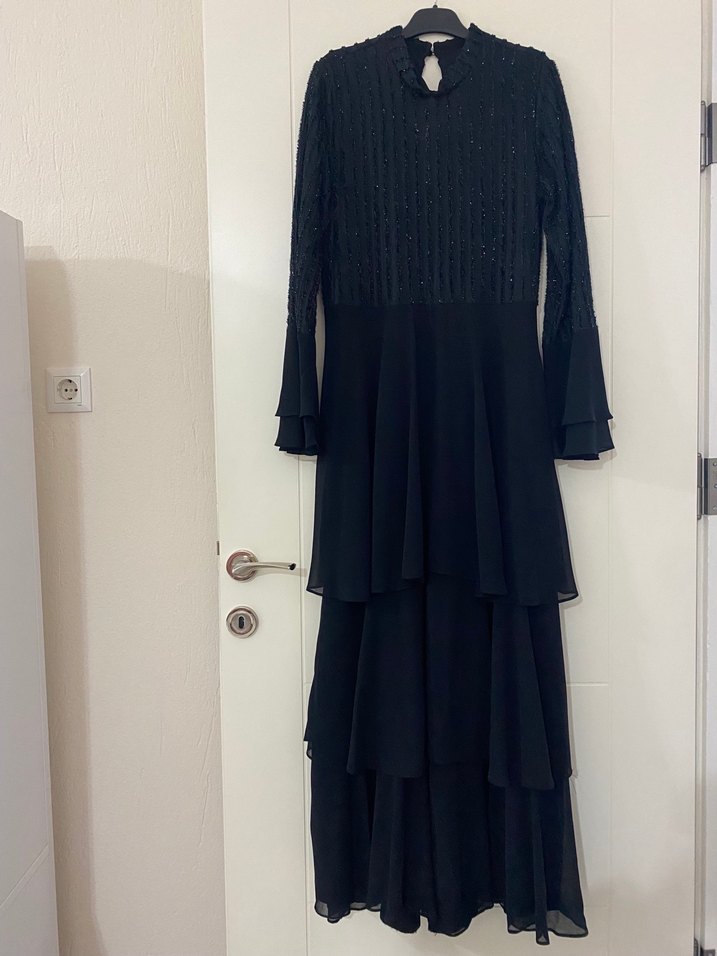 Siyah Uzun Kollu Şifon abiye elbise