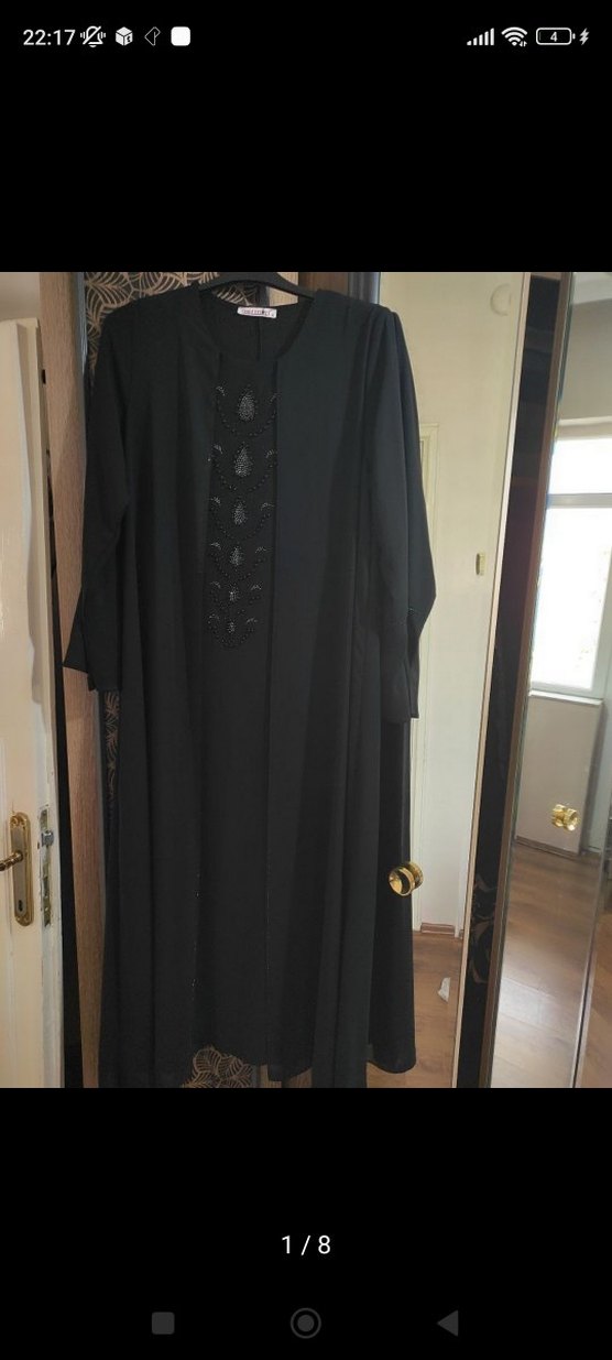 Siyah uzun kollu, bol kesim şifon ve astarlı tarzda uzun elbise. Gotik moda sevenler için koyu ve şık bir görünüm sunar. kollarında ki boncuklardan bir kaçı düşmüş belirtmek isterim resimlerde belli zaten