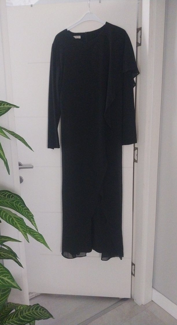 Siyah uzun kollu, sifon detaylı tulum birkere kullanildi