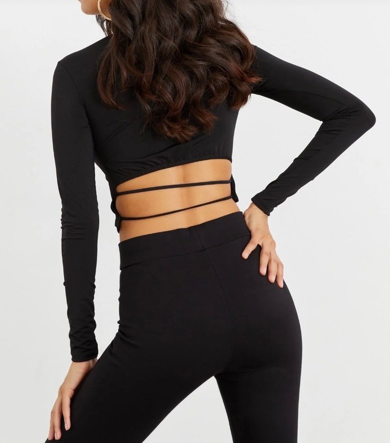 Siyah, uzun kollu, yüksek yakalı ve sırtında elastik ip detayları bulunan, vücuda oturan spor üst.