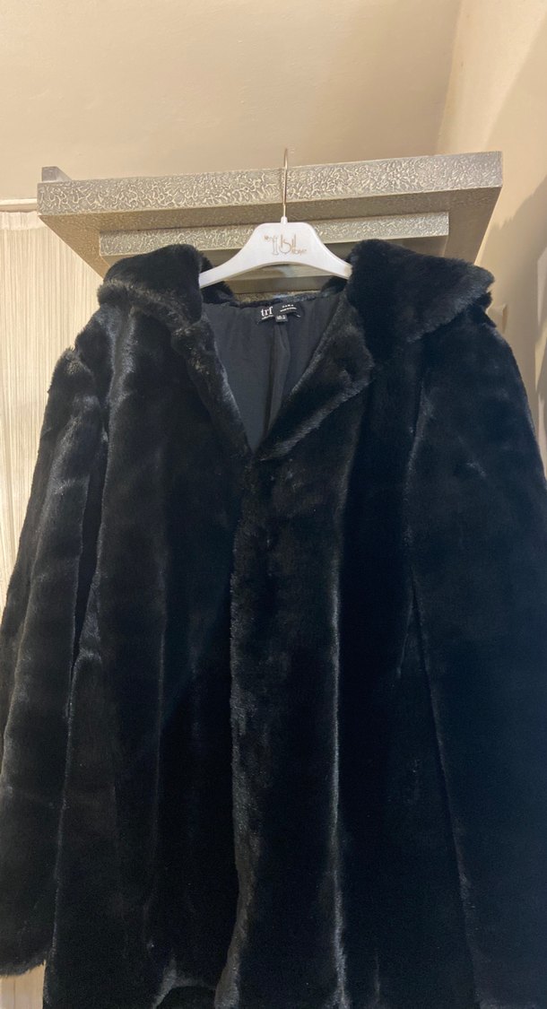 Uzun siyah peluş kürk kaban, yakasında kesimli yaka ve uzun kollu tasarıma sahiptir. Rahat kesimi ve iç kısmındaki sıcak kumaşıyla romantik akşamlar için uygundur.
