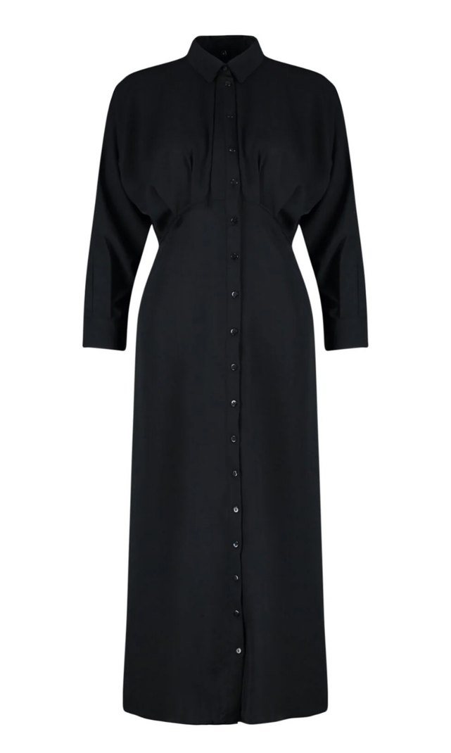 Siyah, uzun kollu ve yakalı uzun elbise, ince ve parlak kumaştan yapılmıştır. Yanında yırtmaç bulunur, sade ve gotik tarzda tasarlanmıştır.