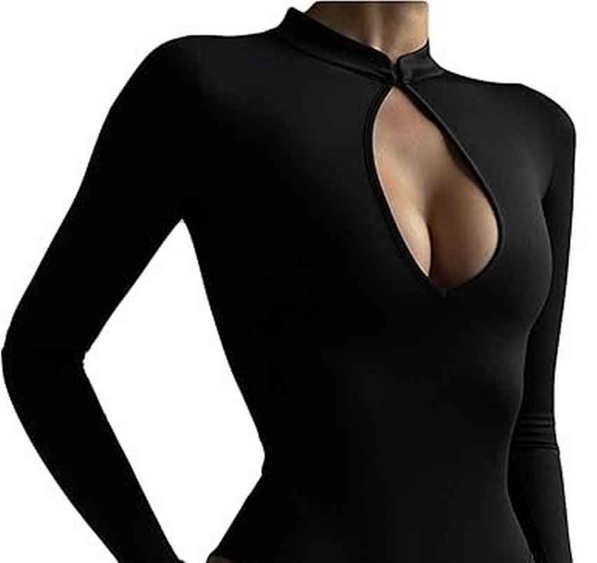 Siyah, uzun kollu ve strappy detaylı bu dar kesim monokini, cesur yırtmaç yakasıyla gotik ve avant-garde tarzları birleştirir. Hiç kullanılmadı özel dikim