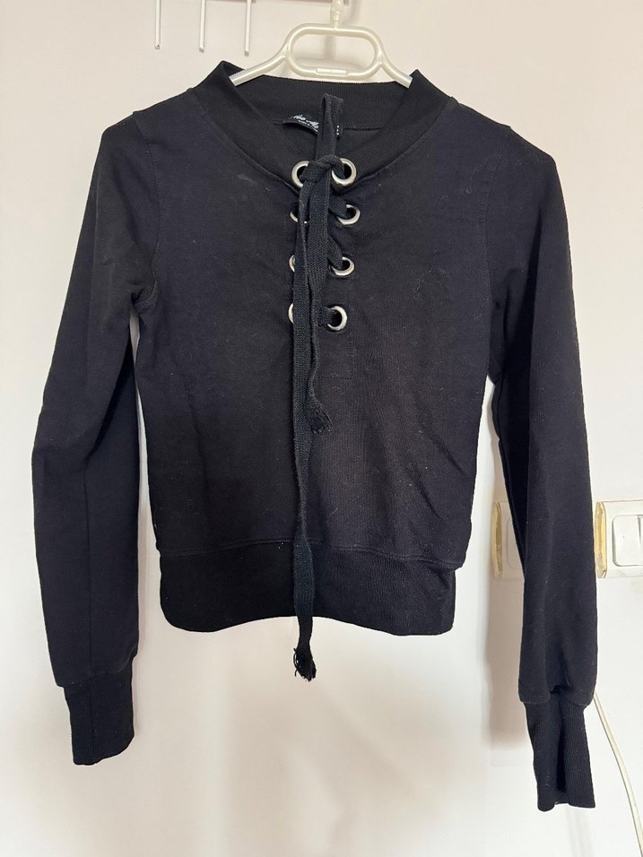 Siyah uzun kollu ve ipli düğmeli, sweatshirt. Rahat ve şık günlük kullanım için uygun.