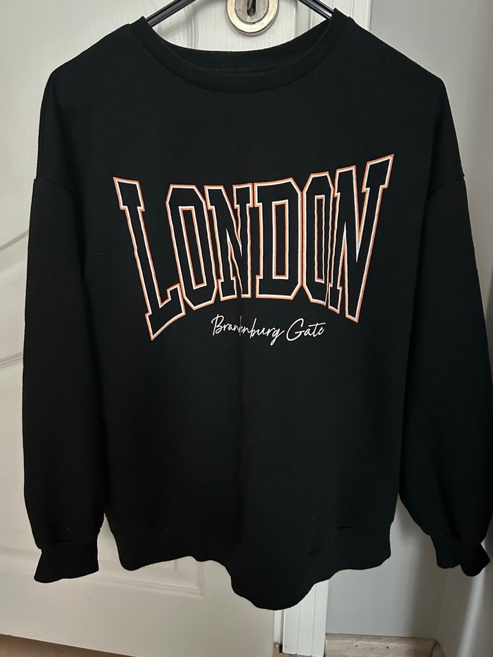 Siyah, "London" baskılı uzun kollu sweatshirt. Salaş kesim ve yuvarlak yaka ile günlük sokak stili için uygundur.