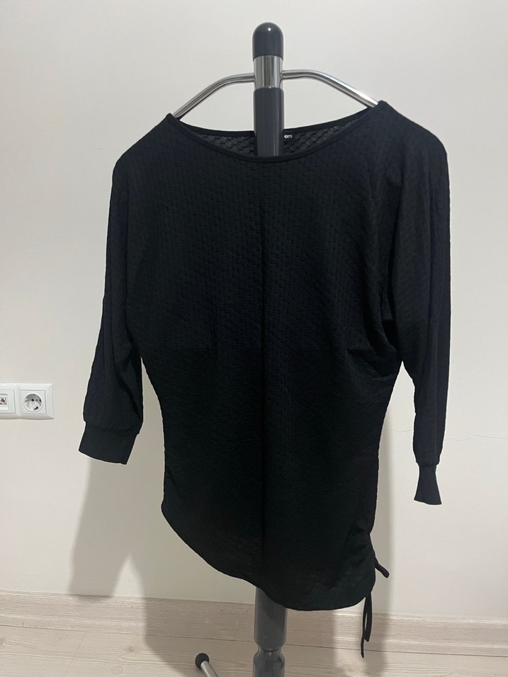 Siyah renkli, yuvarlak yaka ve bol kesim uzun kollu bluz. Pilili detaylara sahip, sentetik kumaştan üretilmiştir.