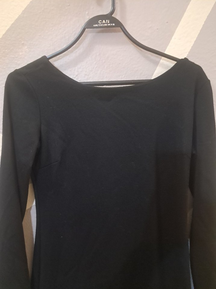 Siyah, uzun kollu, tek renk, tekne yakalı, vücuda oturan elbise Minimalist gotik tarzda, günlük kullanım için rahat ve şık.
