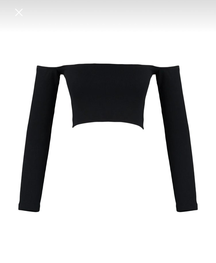 Siyah, tekne yaka ve uzun kollu, vücuda oturan bluz. Düz, teknolojik kumaştan midi boyda, minimal gotik tarzda günlük kullanım için.