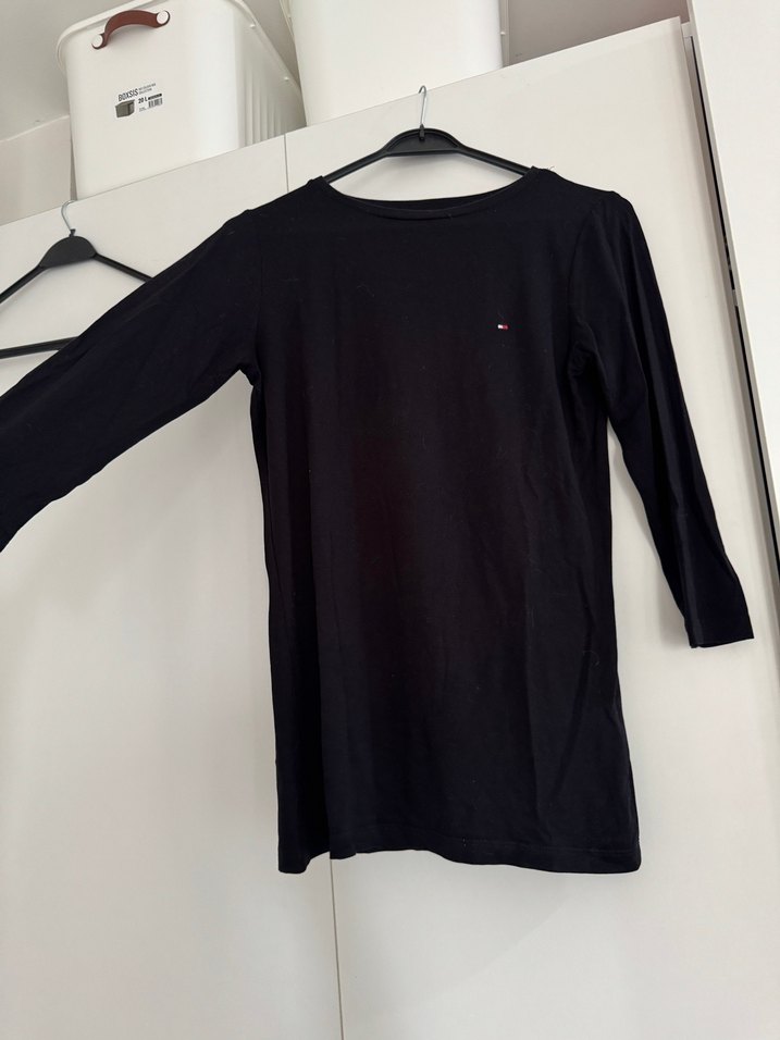 Siyah renkli, uzun kollu, yuvarlak yakalı hamile tişörtü, rahat kesim ve midi boyda, yumuşak keten kumaştan günlük kullanım için uygundur.