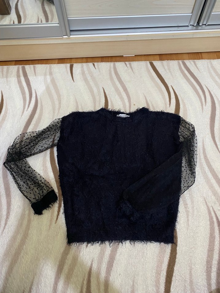 Siyah triko bluz, gevşek kesim, yuvarlak yaka ve ince puantiyeli transparan uzun kollara sahiptir. Kısa boyu ile gündelik gotik tarzı tamamlar.
