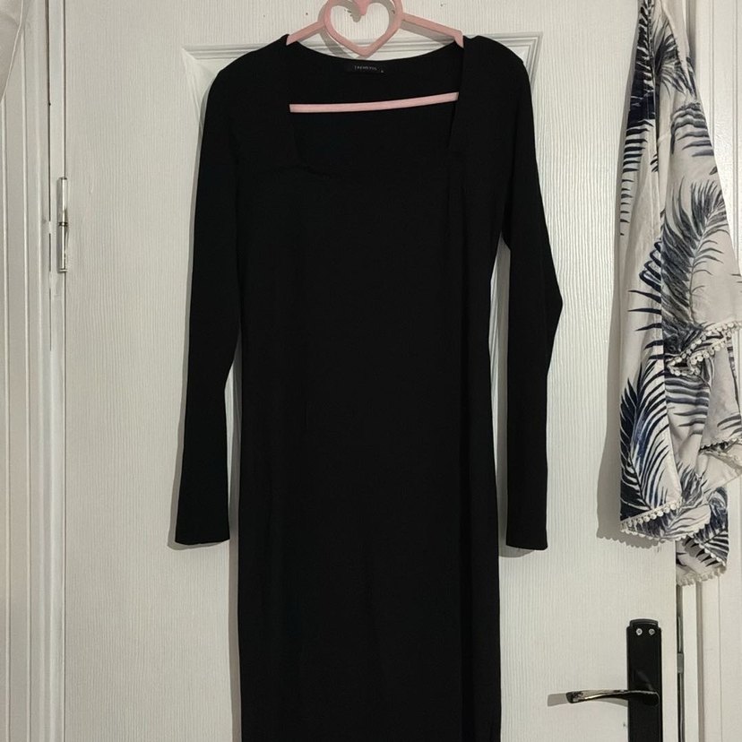 Siyah uzun kollu, kare yaka, dar kesim triko elbise, yırtmaç detayı ile minimalist gotik tarzda, sentetik kumaştan yapılmıştır.