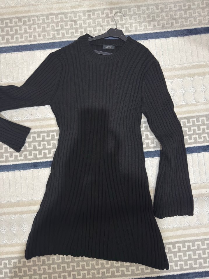 Siyah renkli, uzun kollu ve boğazlı triko elbise, rahat ve şık günlük kullanım için uygundur.