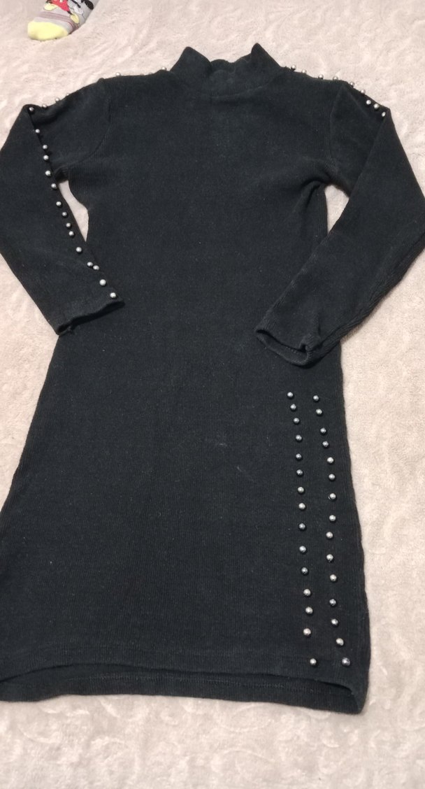 Uzun kollu, yüksek yakalı siyah triko elbise, kol ve yanlarda düğme detaylı. Rahat ve günlük kullanıma uygun.