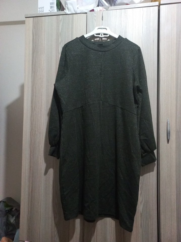Siyah renkli, uzun kollu ve yuvarlak yakalı triko elbise. Rahat kesimi ve yumuşak keten kumaşıyla günlük kullanıma uygundur.