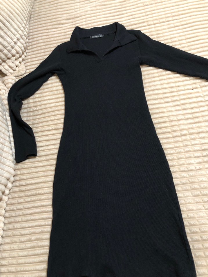 Siyah uzun kollu triko elbise, vücuda oturan kesim ve yakalı yaka ile tasarlanmıştır. Yumuşak sentetik kumaştan yapılmış, minimalist ve normcore tarzda günlük kullanıma uygundur.