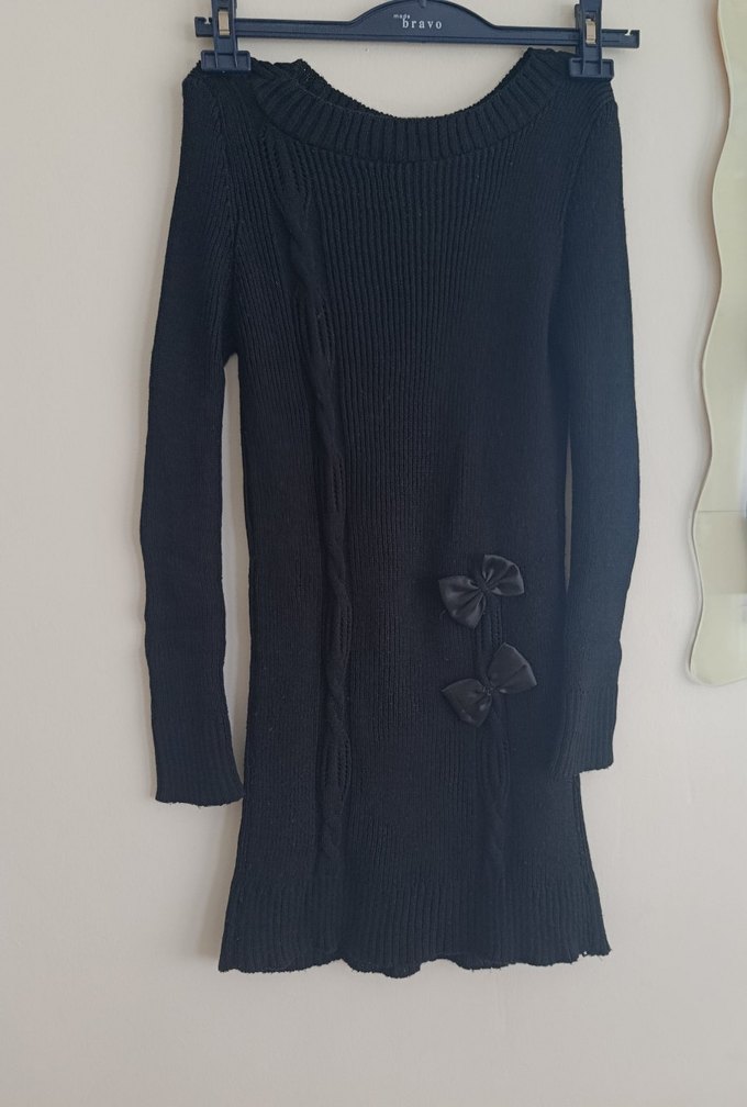 Siyah, uzun kollu, bisiklet yaka, triko dokuma, , fiyonk detaylı, günlük kullanım için uygun. S-M bedene uyumlu şık elbise
