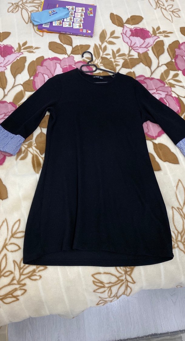Siyah triko elbise, uzun kollu ve çizgili manşetli. Yuvarlak yaka, bol kesim ve dizüstü boyda, yumuşak triko kumaştan günlük kullanım için uygun.