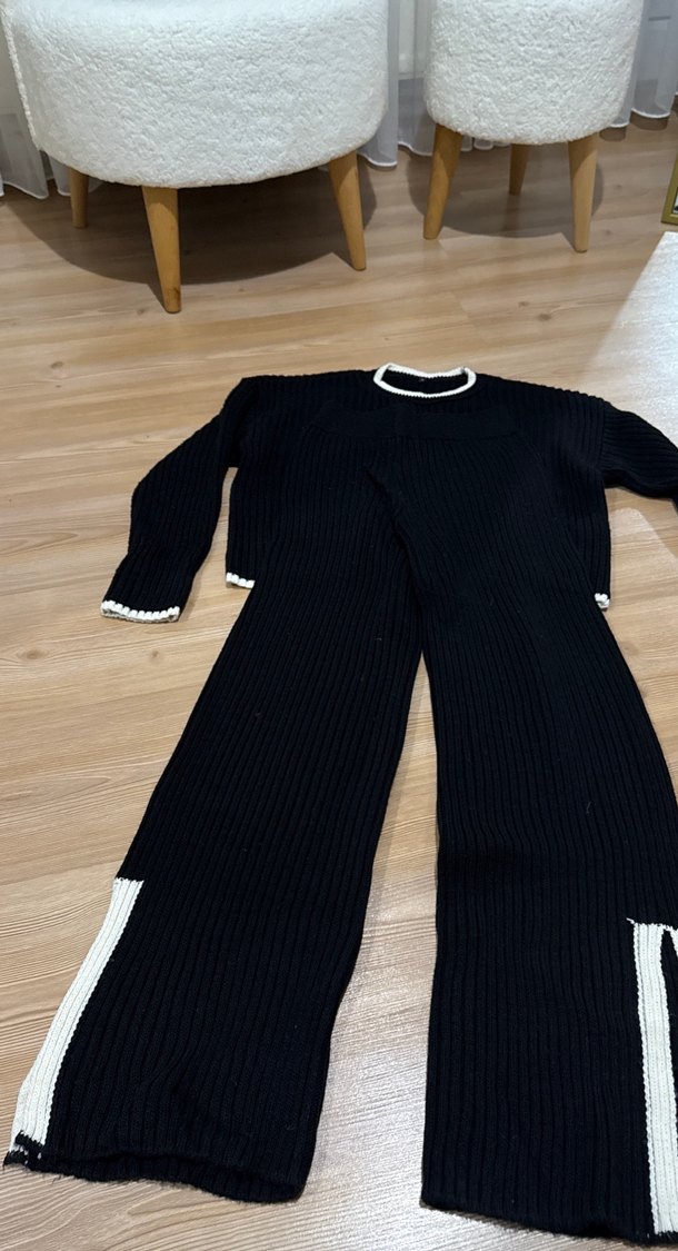 Siyah renkte, uzun kollu ve uzun kesim triko kadın kazak. Yuvarlak yaka ve beyaz detaylarla sade, rahat bir tasarım sunar.