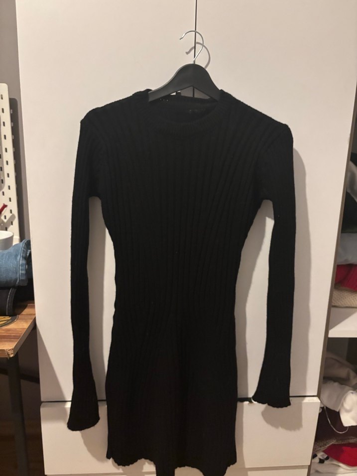 Bu siyah triko elbise, uzun kollu ve yüksek yakalıdır. Midi boyu ve desensiz yapısıyla günlük kullanıma uygun şık gotik tarz sunar.