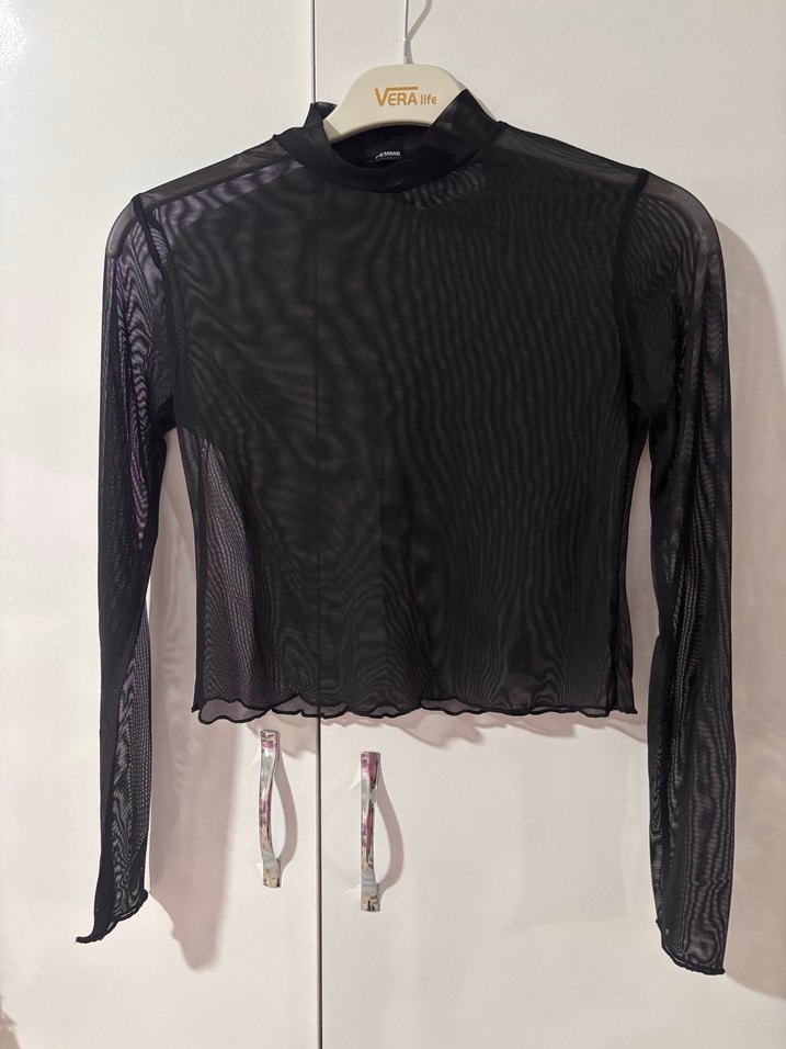 Siyah uzun kollu, tül görünümlü, dik yakalı ve pileli dokulu sentetik kumaştan yapılmış fitted bluz. Günlük kullanıma uygun gotik tarzda.