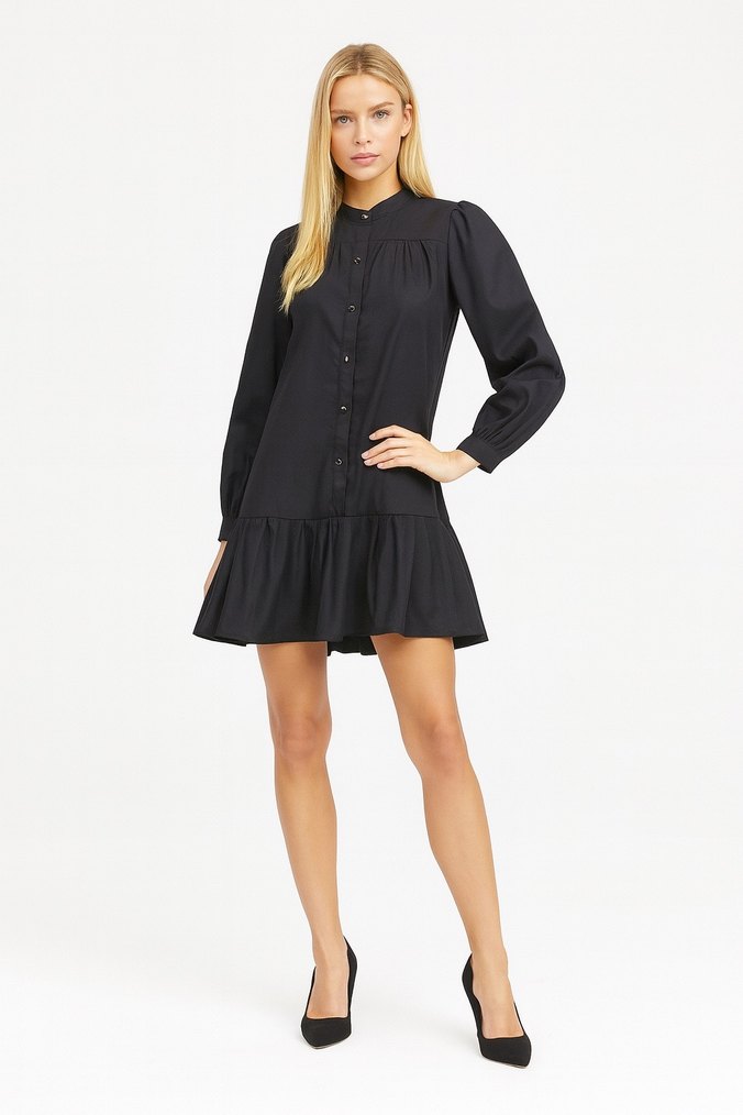 Siyah renkli, yüksek yakalı, uzun kollu ve bol kesim tunik, fırfır detaylarıyla ofis ve günlük kullanım için uygundur.