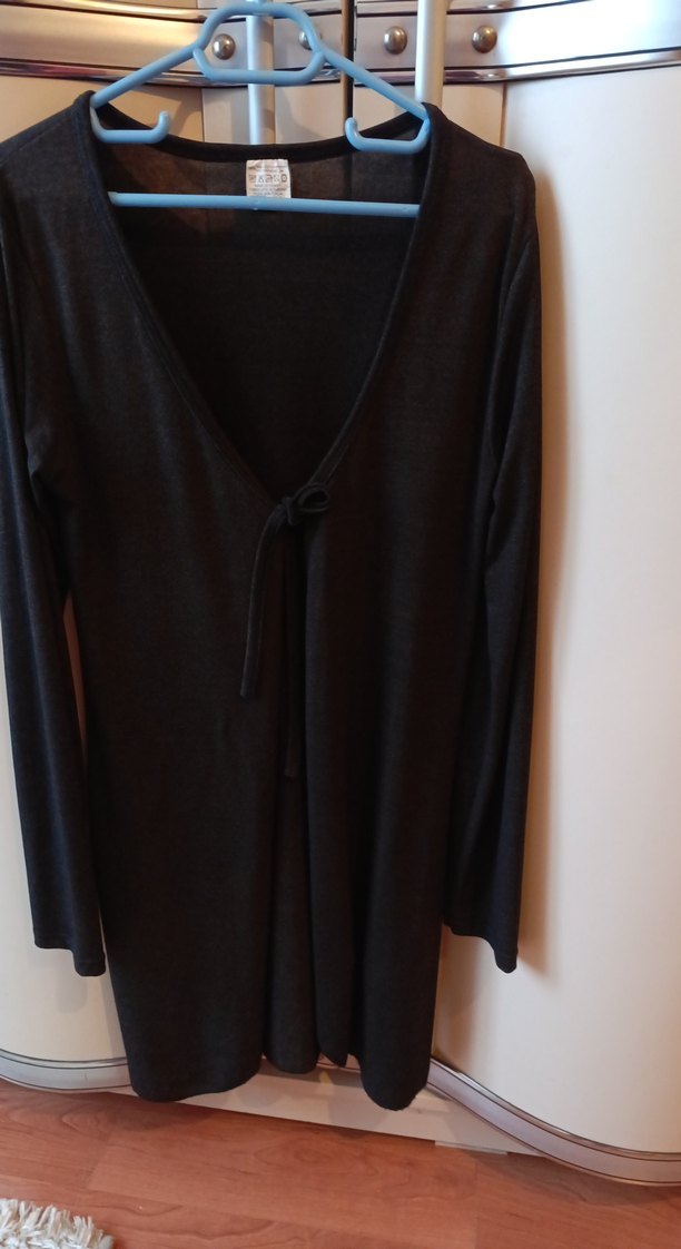 Siyah, uzun kollu ve V yakalıi, ipeksi kumaştan olup penye uzun tunik yaz için uygun