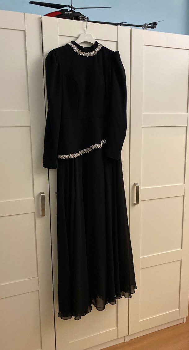Siyah renkli, uzun kollu ve yüksek yakalı uzun abiye elbise. Drapeli tasarım ve boyun ile belde süslemeler bulunur. Düğün için uygundur. Sadece 1 gece kına gecesinde giyilmiş ve yep yenidir. Ümraniye ilayda butikden alınmış olup kaliteli bir üründür ve alalı 1 hafta olmuştur.Fiyatıda oldukça diğerlerine göre çook makul olup sabit fiyattır.