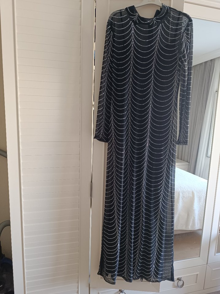 Uzun kollu, siyah uzun abiye elbise, ince kesim ve tek tek bir seferde düğünde giydim hiç sorun yok 44 bedene de olur üstü tüldur