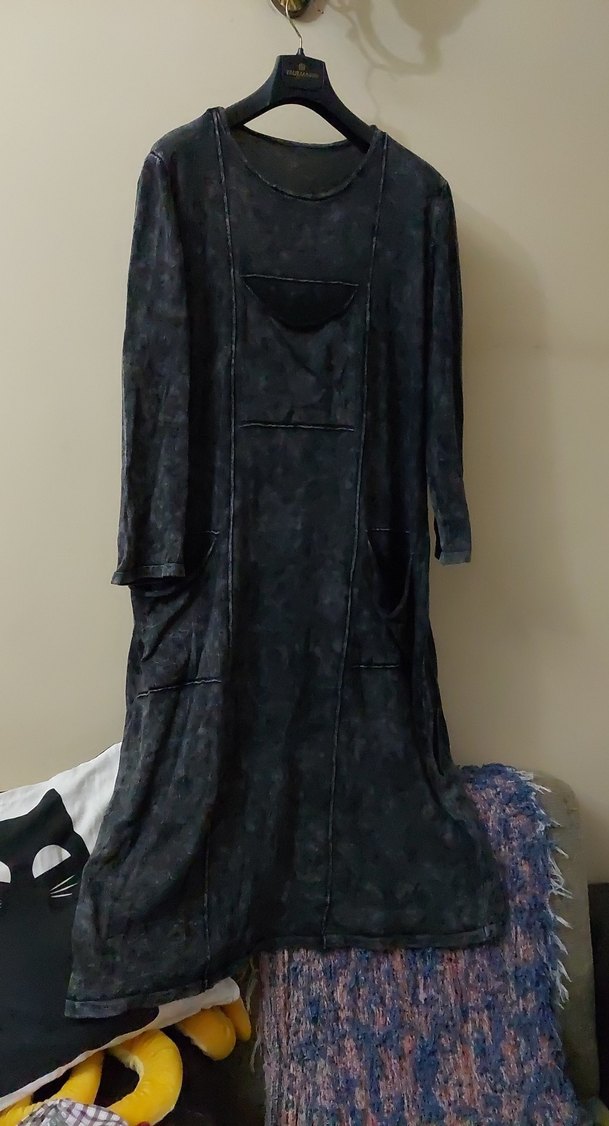 Siyah, uzun kollu, bol kesim ve yuvarlak yakalı uzun elbise. Drapeli tasarımı ve hafif bağlama deseniyle günlük kullanım için uygun. Tesettüre uygun olabilir, dizlerin altında bitiyor.