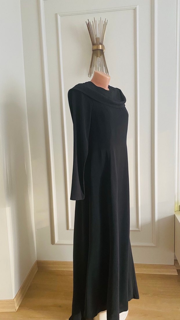 Siyah krep kumaş kuyruk detaylı uzun elbise