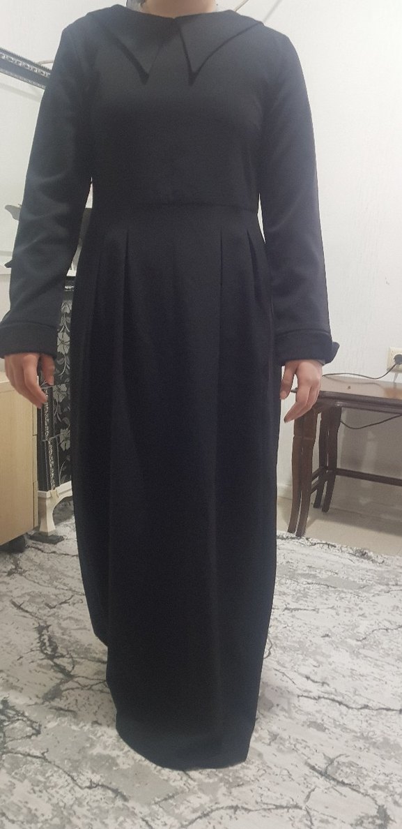 Siyah uzun elbise, uzun kollu ve notlu yaka detaylıdır. Sentetik ve esnek kumaştan, düzenli kesimdir ve ofis için uygundur. Gotik ve mütevazı tarzda.